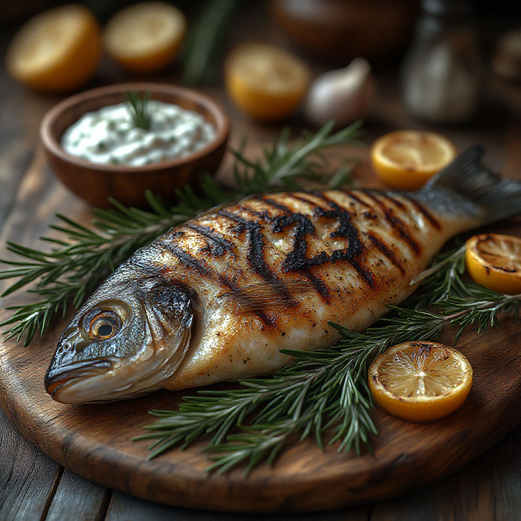 - Основное блюдо: Рыба на гриле с лимоном и розмарином.